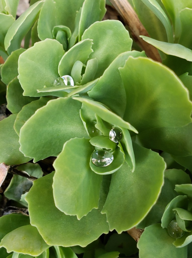 Nature's mystery sprightly beads nestle betwixt succulent leaves